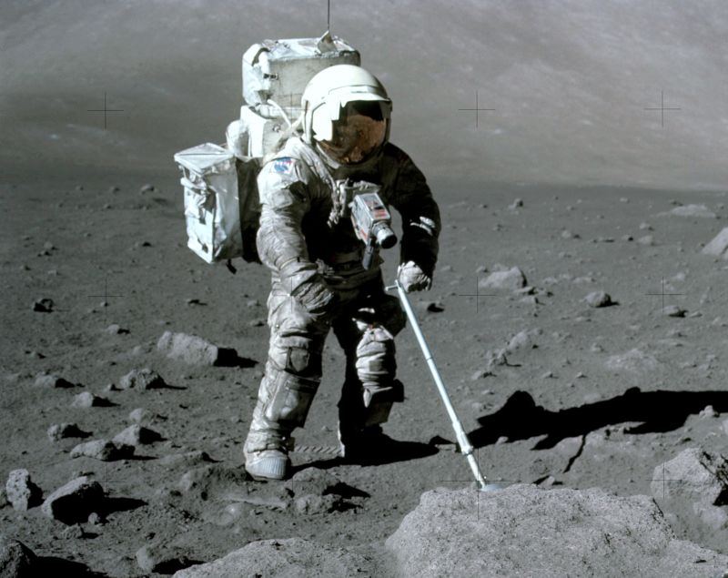 塞尔南将“挑战者”号登月舱降落在预定的陶拉斯-利特罗地区,正好位于澄海地区的东南方向,而澄海是月球上一片具有重要地质特征的区域。此次任务的规划者们希望这片区域能够提供大量关于月球表面地质历史的信息。着陆之后,塞尔南和施密特便开始了对月球表面的观测: