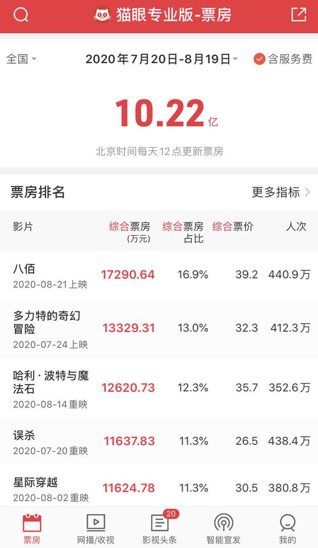 在电影院复工的第31天(7月20日-8月19日),国内电影总票房累计突破10亿,全国超过9000家影院恢复营业,观影人次达到215万,毫无疑问,电影市场在火速升温中。