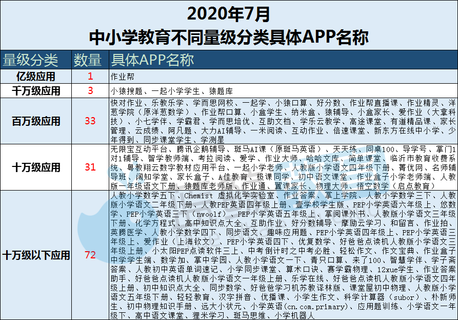 综合以上分析维度,7月份中小学应用规模整体下降,不过使用时长与启动次数均有上涨,用户粘性在加强,“学而思网校”“好分数”取代“作业帮口算”“小盒学生”重新回归TOP 10位次,各级别规模APP数量与领域渗透率变得相对固定,中小学教育APP数据进入平稳期。