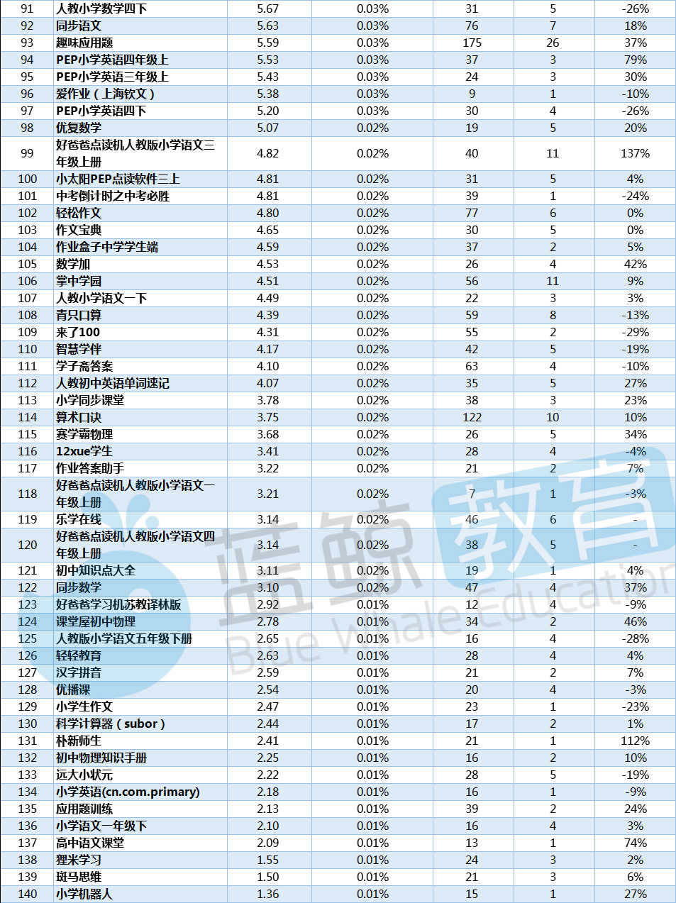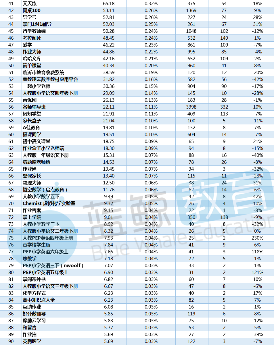 用户规模下跌比较明显的APP有:“粤教翔云数字教材应用平台”用户规模6月环比下降42%,“人教版一年级语文下册”下降40%,“作业拍”下降39%,“人教小学数学三下”下降32%,“作业通”下降32%,“来了100”下降29%,“翼课家长”下降28%……7月APP整体下降幅度偏小,大部分APP用户规模趋于稳定。