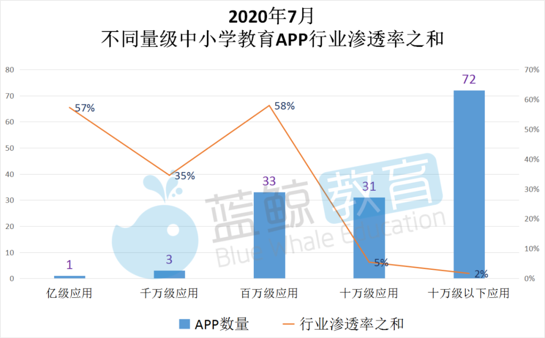 下面,蓝鲸教育智库把140家中小学教育APP,按照用户规模,分别以1亿、1000万、100万、10万为界限做量级分类,得到的结果如下图所示: