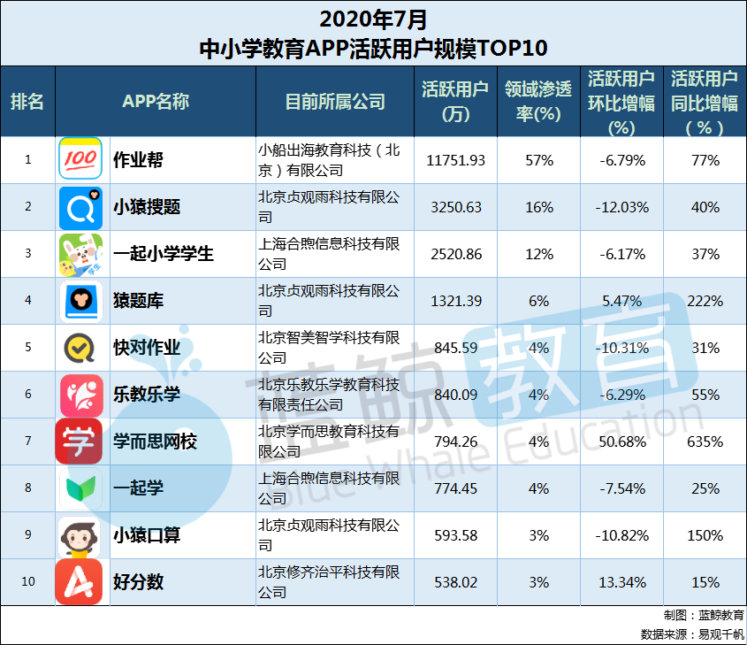 其中,“小猿搜题”“猿题库”“小猿口算”同属于一家公司,“一起小学学生”“一起学”同属于一家公司。