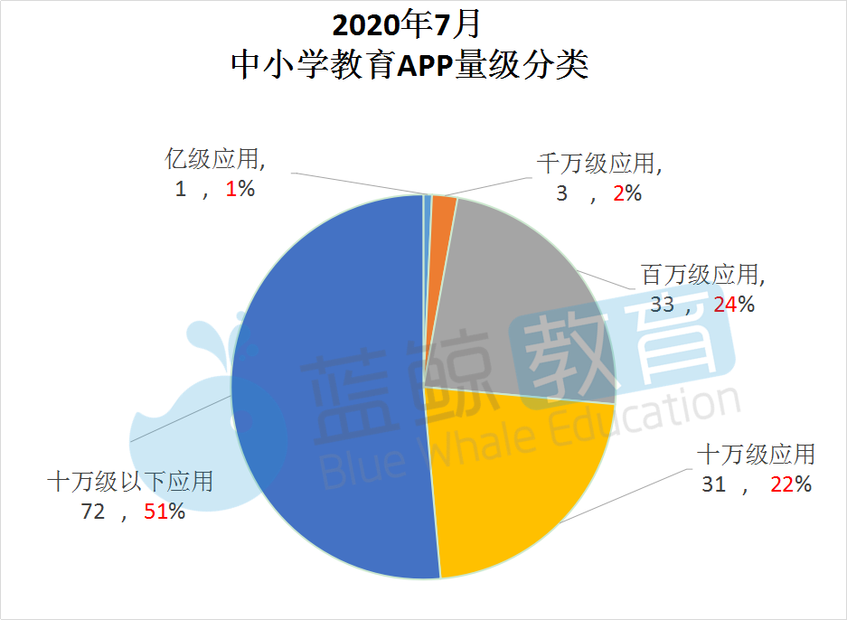 千万级用户规模APP共3家,占比2%,分别是:“小猿搜题”“一起小学学生”“猿题库”,7月无变动,“乐教乐学”于6月末甩出千万级规模应用之后,再度小幅下降6%,无缘千万巨头。