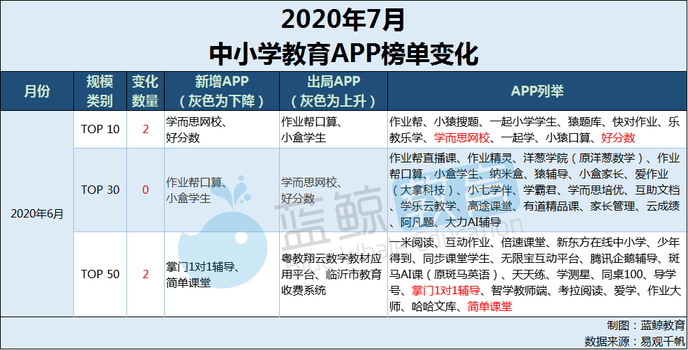 为了更好的梳理7月末外语学习赛道具体的APP数据变化。蓝鲸教育智库选取了2020年6月末到7月末,中小学教育APP的具体榜单变化,下图是“2020年7月中小学教育APP榜单变化”:标灰色的APP表示从上一级别甩出到下一级别或者从下一级别进入上一级别,并不算作该级别新增APP;标红的为7月各TOP排行榜等级上升的APP: