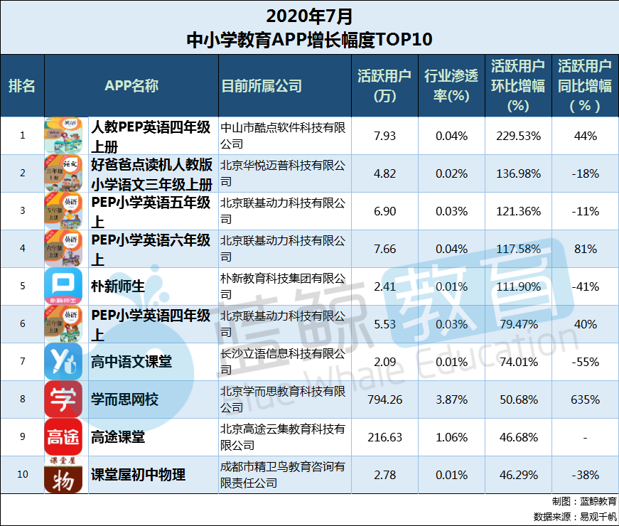 2020年7月末用户增速前十的APP分别是:“人教PEP英语四年级上册”“好爸爸点读机人教版小学语文三年级上册”“PEP小学英语五年级上”“PEP小学英语六年级上”“朴新师生”“PEP小学英语四年级上”“高中语文课堂”“学而思网校”“高途课堂”“课堂屋初中物理”。