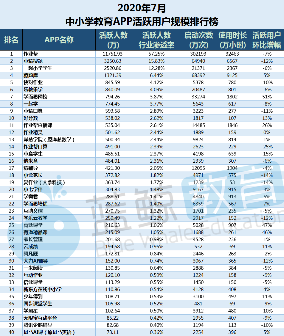 “小猿搜题” 位列第2名,用户规模3250.63万,环比下跌12.03%,第三名“一起小学学生”月活跃用户2520.86 万,7月末下跌6.17%。