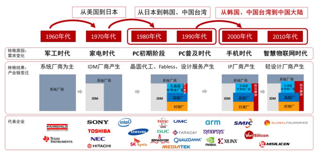 上世纪70年代起,美国将半导体系统装配、封装测试等利润含量较低的环节转移到日本等其他地区,由此促成了半导体产业的第一次分工细化。