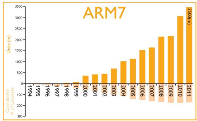 2007年以后,ARM7授权的许可证数量基本没有变化,ARM也早已停止了对这款芯片IP的支持。但截至2011年,使用该IP的芯片出货量仍在快速增长,ARM也一直在收取相应版税。