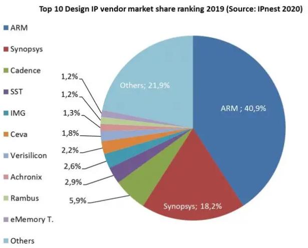 私有化并退市并没有影响ARM的行业地位。2019年,ARM依旧以40.9%的市占率雄踞芯片IP市场第一位,紧随其后的两大EDA软件公司分别是Synopsys(下称新思科技)和Cadence(下称铿腾电子)。在这份排名中,芯原股份市占率为1.8%,排名第七。