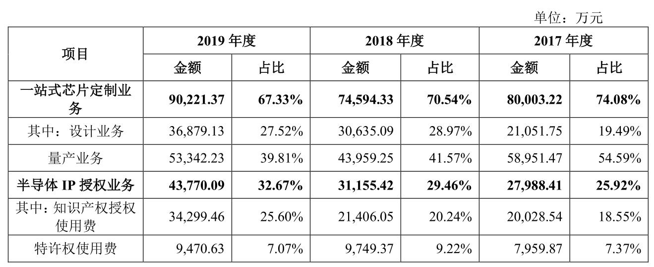 其中,一站式芯片定制服务可进一步分为芯片设计和芯片量产业务。芯片设计覆盖交付给客户芯片样片前的环节,量产业务则是为芯片量产提供生产管理服务;芯片IP授权业务则分为授权使用费和特许权使用费(即版税)。