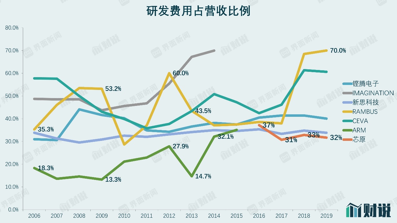 在芯片IP行业,大多数公司研发费用占营收比例在30%到40%这一区间,个别公司在某些年份甚至能达到70%。ARM由于规模效应,这一比例可以压低至30%以下。