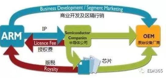 该模式是这样运作的:半导体公司向ARM支付固定的授权费(License),获得ARM的IP一次或多次使用权。在芯片量产销售后,半导体公司还要向ARM支付按单位计价的版税(Royalty)。