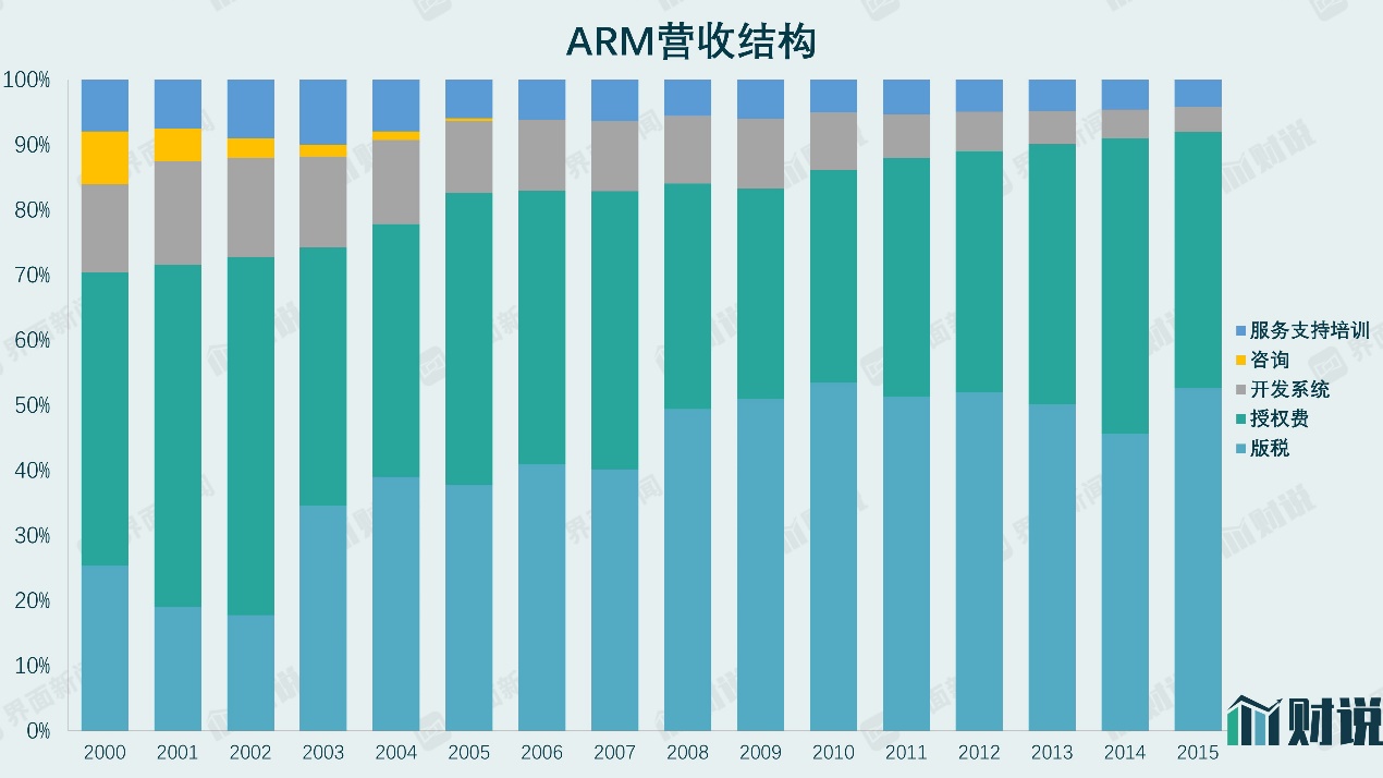 ARM财报显示,其收入分为授权费、版税、开发系统、咨询和服务支持培训五类。2000年到2002年,授权费是最主要的收入来源,随之而来的还有可观的服务和咨询收入。这段时间的ARM还处在拓展“朋友圈”阶段,使其芯片IP能够获得更多芯片厂商的认可。