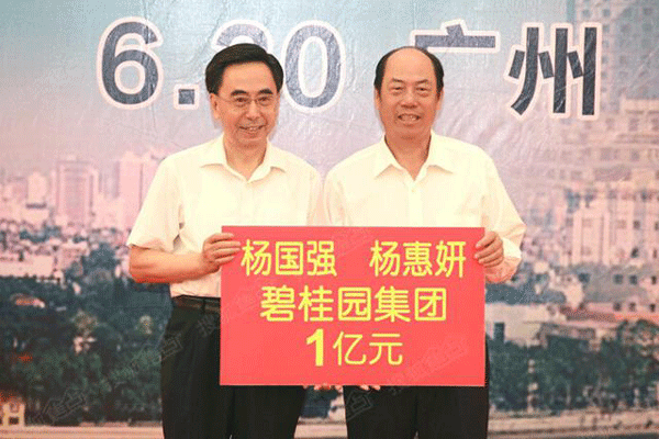 ▲图注:2015年广东扶贫济困日活动仪式上,在广东省省长朱小丹的见证下,碧桂园集团董事局主席杨国强与女儿杨惠妍认捐1亿元。