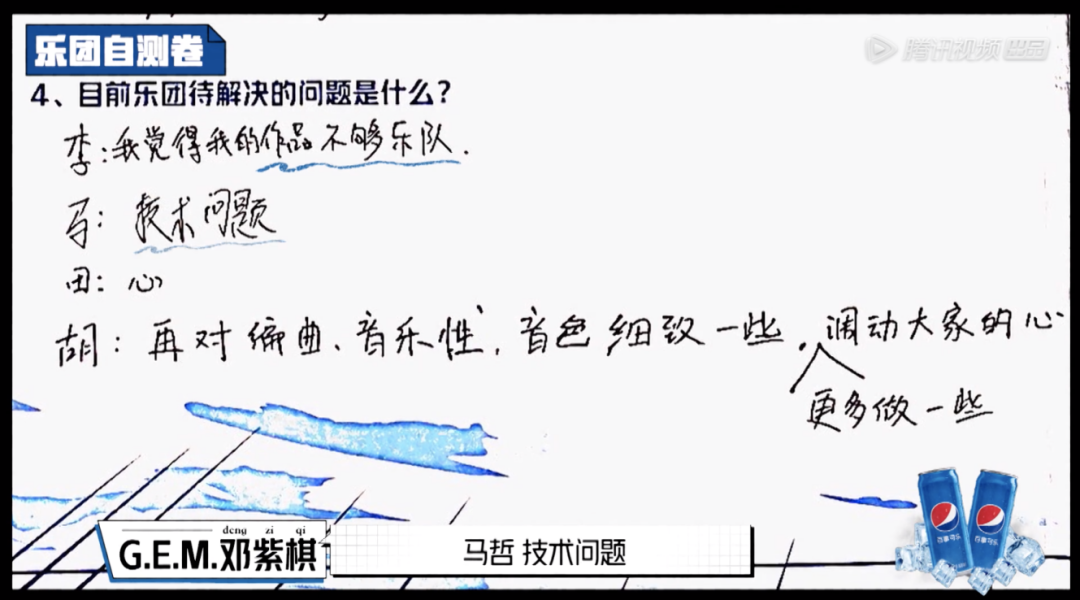 像是公认的在音乐性上非常成熟的水果星球,在填写与教师团交流的试卷时,直接写上了觉得团队最需要的是“人气担当”,甚至因为人气一度垫底的问题,在跟老师交流时没有主动选择第五人,表示担心团队这轮可能都走不下去,有点灰心。