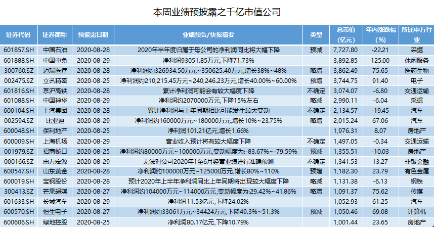疫情之下,医药板块也表现分化。复星医药(600196.SH)、爱尔眼科(300015.SZ)、迈瑞医疗(300760.SZ)、云南白药(000538.SZ)将发布中报。迈瑞医疗预计上半年实现净利润约32.69亿元-35.06亿元,同比增长38%-48%,因二季度开始,公司开始向海外市场出口新冠抗体试剂,弥补了疫情对体外诊断产线造成的部分影响。