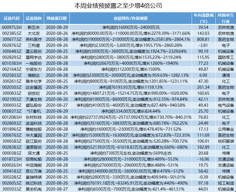 本周还有至少113家公司预计2020年上半年业绩增长一倍以上。其中业绩预增至少4倍的公司有28家,更有10家公司最低预增幅度超过10倍,分别为新五丰(600975.SH)、大北农(002385.SZ)、英科医疗(300677.SZ)、三利谱(002876.SZ)、星云股份(300648.SZ)、星网宇达(002829.SZ)、一拖股份(601038.SH)、宁波东力(002164.SZ)、雅本化学(300261.SZ)、达安基因(002030.SZ)。