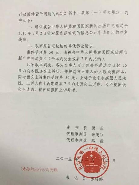 12月22日,北京第一中级人民法院对导演范坡坡起诉广电总局一案做出一审判决,认定广电总局对于下架范坡坡导演的同性恋题材纪录片《彩虹伴我心》的公开回复违法,同时驳回了范坡坡的其它诉讼请求,广电总局支付诉讼费用50元。这是中国第一起起诉广电总局获立案并认定总局违法的案子。