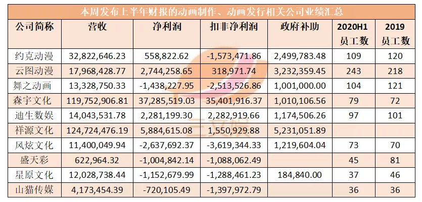 在三文娱统计的表格中,仅4家公司上半年在扣除非经常性损益后仍有利润,同比净利增加的仅云图动漫、森宇文化(动画发行是它的一部分业务)、迪生数娱3家公司。