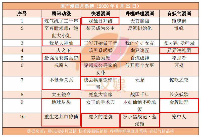 腾讯动漫方面,本月排名榜首的是《炼气练了三千年》,《炼气练了三千年》是一部后宫修仙漫画,作者刺猬猫阅读,截至8月22日,《炼气练了三千年》更新到了112话,累计收获13.3万讨论数,本周获4.2万张月票。