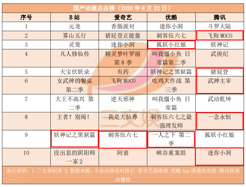 B站方面,本周排名第一的仍旧是《元龙》,截至8月22日,该作更新至10集,总播放量1.1亿,追番数295.2万,本周综合得分8422720。