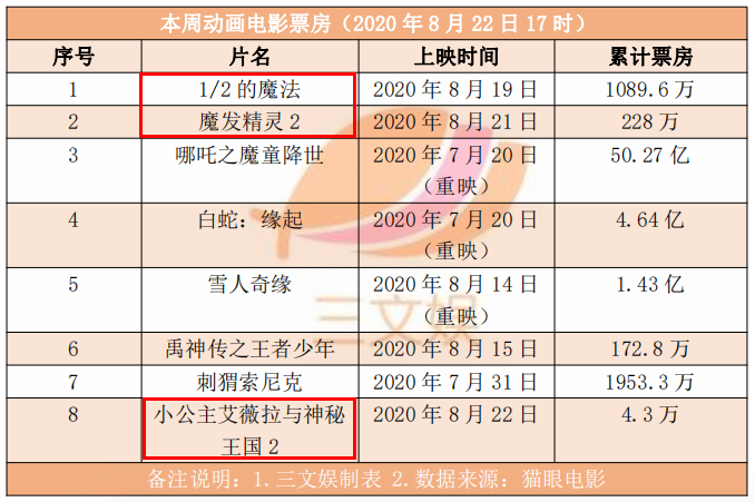 动画电影方面,本周有三部动画电影上映,分别是8月19日上映的《1/2的魔法》、8月21日上映的《魔发精灵2》和8月22日上映的《小公主艾薇拉与神秘王国2》,票房分别为1089.6万、228万和4.3万。