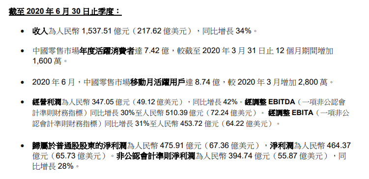 近日,阿里巴巴发布了2021年第一财季的财报,数据截止至2020年的6月30日。财报显示,阿里巴巴在这一财季的收入为1537.5亿元,同比增加了34%。其中阿里巴巴来自中国零售商业的收入为1013亿元,同比增长34%。