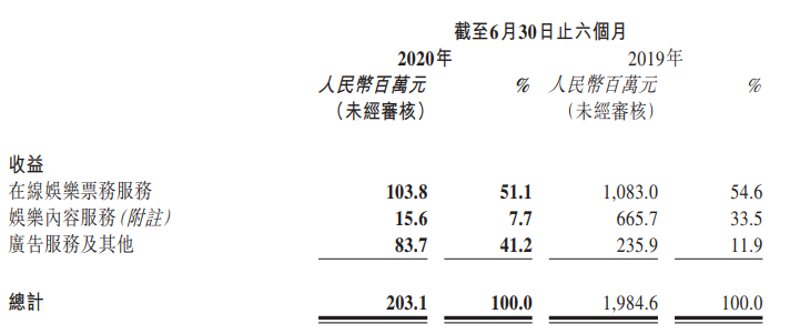 相比以往,今年的成绩相当惨淡了,主要的亏损点在于疫情的影响,在线娱乐票务服务、娱乐内容服务、广告及其他收益均有着大幅下跌,在线娱乐票务服务收入从去年的10.83亿骤减至1.038亿,同比减少90.41%;娱乐内容服务收入从去年的6.66亿下降至0.16亿,同比减少97.66%;广告服务及其他也从2.36亿下降到0.84亿,同比减少64.5%。
