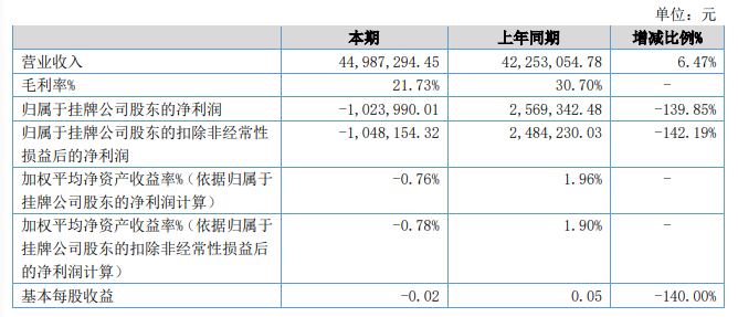 凯迪威今年上半年营业收入为4498.7万元,上年同期为4225.3万元,同比增长6.47%,但净亏损达到102.4万元,同比下降139.85%。
