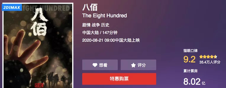 根据猫眼电影显示,8月21日上映的电影《八佰》目前票房已突破八亿,成为疫情之后票房表现最好的电影。