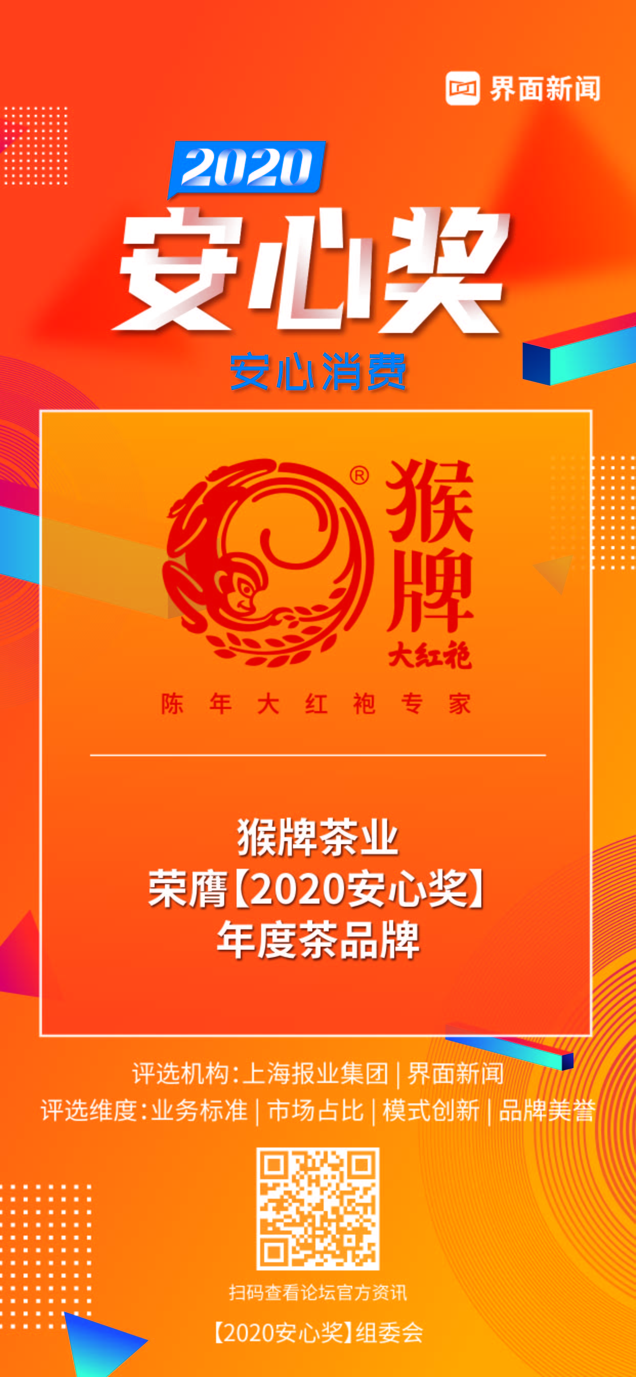 8月27日,上海报业集团l界面新闻在上海鲁能JW万豪侯爵酒店举办了【2020安心奖】颁奖典礼,并正式公布了本年度获奖名单。围绕“安心消费”这一核心价值,来自电商、食品、饮品、美妆、白酒、餐饮等领域优秀企业,夺得了30项年度大奖。猴牌茶业凭借精湛的非遗传统工艺和蕴含的文化韵味,荣膺年度茶品牌大奖。