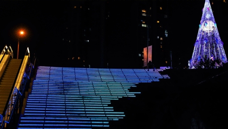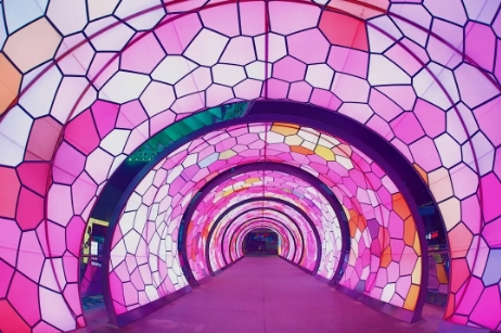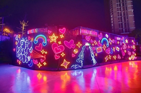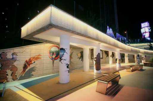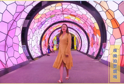 天黑之后,时光隧道变得更加五彩斑斓。从远处看就像是发着光的外太空隧道,桃红色的外观一眼就能抓住眼球