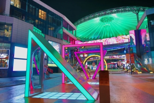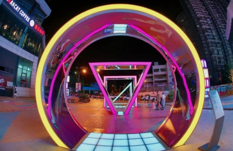 用4组哈哈镜呈现不同的视觉扭曲效果。在这里可以变大变小,拉长缩短,总有一款你喜欢的。些许小烦恼,都可以在这里找到快乐的自己吧~晚上的哈哈镜就更有趣了。用脚能踩出“一道彩虹,因吹斯汀!