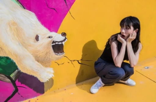 无论是坐在台阶上,还是站在车道从下往上拍,都很容易出片。因为涂鸦墙的色彩本来就很丰富,拍照时穿搭一些单色衣服就可以了。