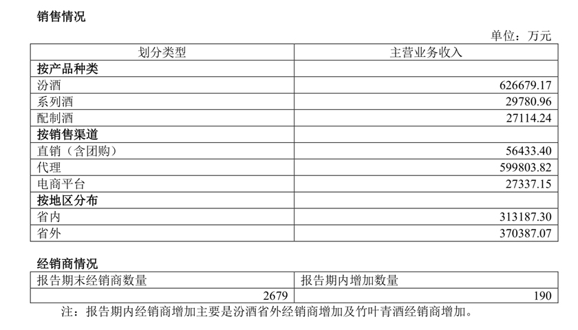 根据公告显示,按产品种类划分,今年上半年汾酒、系列酒、配制酒分别实现主营业务收入为62.67亿元、2.98亿元、2.71亿元,其中青花汾酒系列在深度开展核心终端建设下,收入同比增长超30%;按销售渠道划分,今年上半年直销(含团购)渠道、代理渠道、电商平台实现主营业务收入分别为5.64亿元、59.98亿元、2.73亿元;按地区换分,今年上半年省内、省外分别实现营收31.32亿元、37.04亿元。