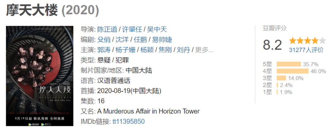 相比之下,《摩天大楼》对节奏的把控要成熟许多。整体是一个致郁故事,但其中设置了许多笑点、泪点与惊吓点,令观众情绪得到及时的舒缓和宣泄,从而可以连续刷下去。这一部也是三部悬疑新剧中最早开启超前点播的。