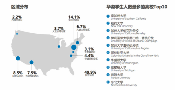领英会员数据库显示,美国东西海岸因聚集大量美国顶级高校而备受中国留学生亲睐。其中大纽约地区、旧金山地区及洛杉矶地区的华裔学生人数最多,分别占留学总人数的14.1%、8.5%和7.5%。华裔学生人数最多的3所大学为南加州大学(University of Southern California)、纽约大学(New York University)和加州大学伯克利分校(University of California, Berkeley)。