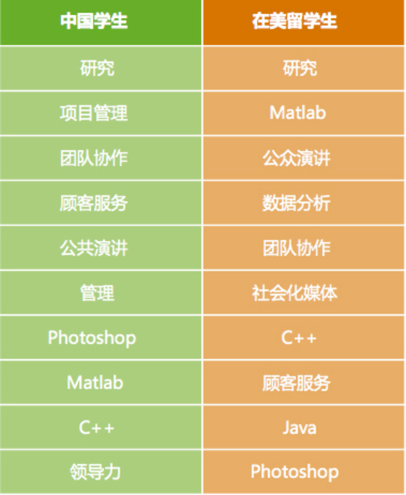 中美教育体系的差异还反映在中国学生和留美学生的技能差异上。中国本土学生强调自己拥有项目管理、领导力等注重经验积累的技能,而留美学生则喜欢突出公众演讲、社会化媒体等自我展示与交流型特长。