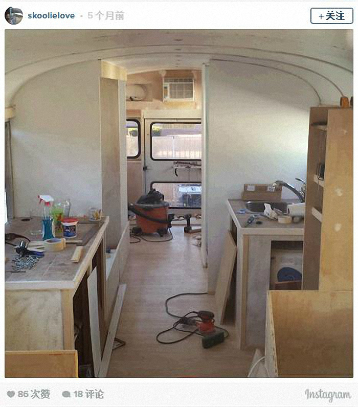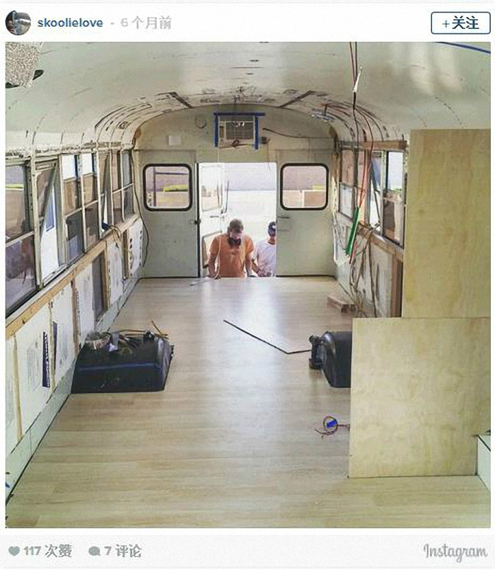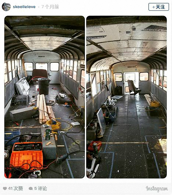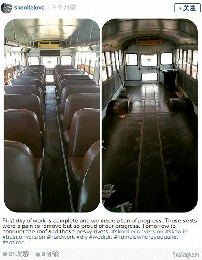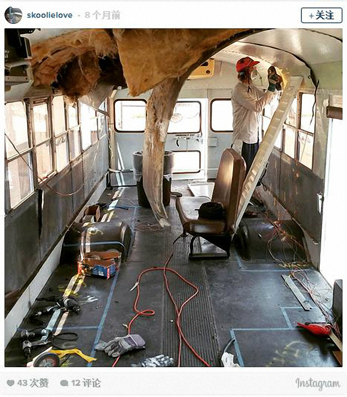 Schmidt在个人Instagram的主页上记录了改造全过程。“第一天工作结束,我们可做了不少事儿。这些座椅可真难弄出来,真骄傲我们做到了。明天的任务是搞定车顶和这些讨人厌的铆钉。”
