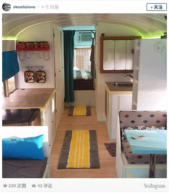 Schmidt和父亲一起动手,将校车的座椅拆下,将其改造成了一辆舒适房车。