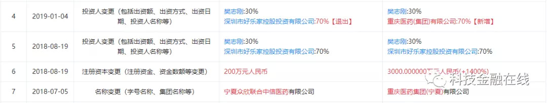 在深圳好乐家入股宁夏众欣一年后,深圳好乐家的股份悉数被重庆医药(集团)股份有限公司收购,宁夏众欣也改名为重庆医药集团(宁夏)有限公司。