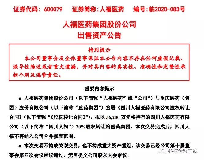 2020年8月,也就是本月,四川人福医药股权发生变更,重庆医药接盘了人福医药持有的全部股份。8月5日,人福医药曾经公告了这一信息,以3.62亿元将持有的四川人福医药70%股权转让给重药集团。