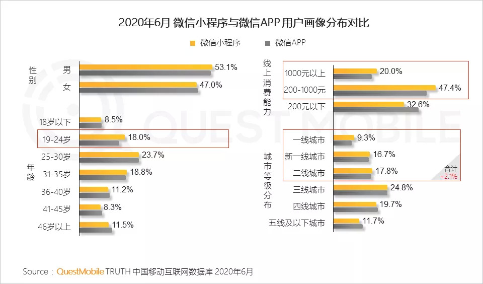 2、微信小程序吸引了更多19-24岁的年轻用户,中高线上消费能力突出,二线及以上城市占比略高于微信APP