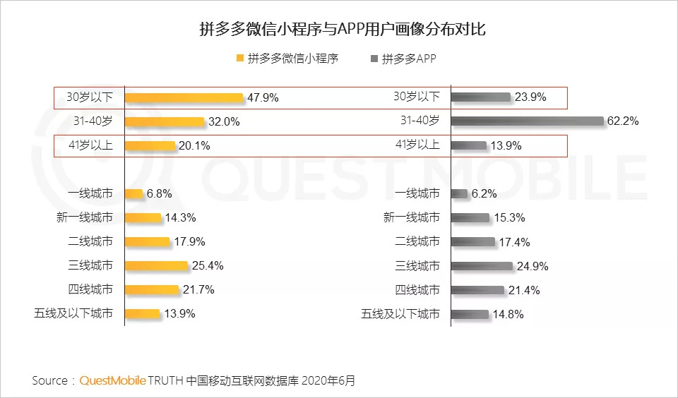 5.3 拼多多APP用户主要为31-40岁中年人群,小程序更多开拓了30岁以下及41岁以上人群,实现对不同年龄阶段用户的覆盖