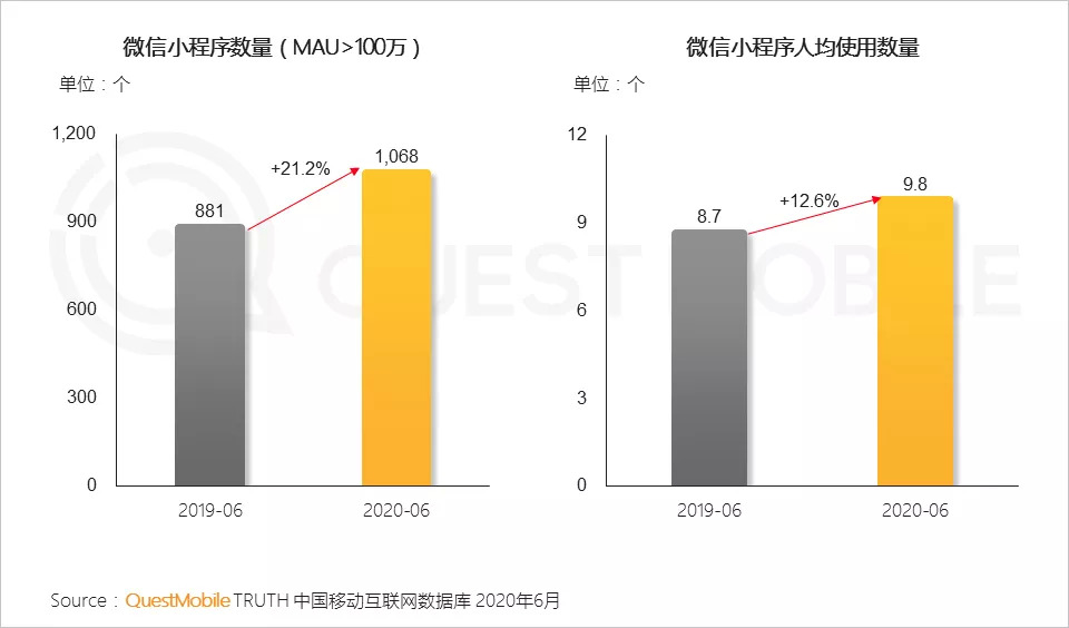 4、微信小程序数量加速增长,月活跃用户百万规模以上小程序已突破1000个,用户人均使用个数也增加到9.8个