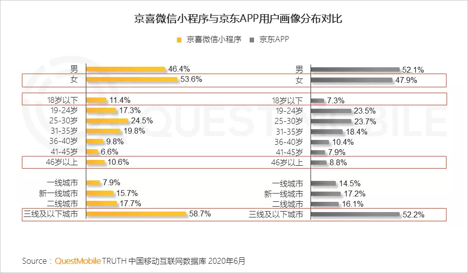 5.2 与京东APP相比,京喜微信小程序吸引了更多女性用户,低价拼团等玩法收获大量下沉市场用户