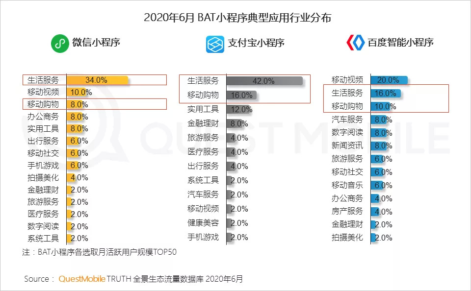 4、生活服务及移动购物成为各平台布局的热点领域;平台特点的差异化在行业分布上得以体现,微信小程序覆盖领域更加丰富,支付宝小程序金融及线下服务场景占比突出,百度智能小程序在移动视频行业优势明显