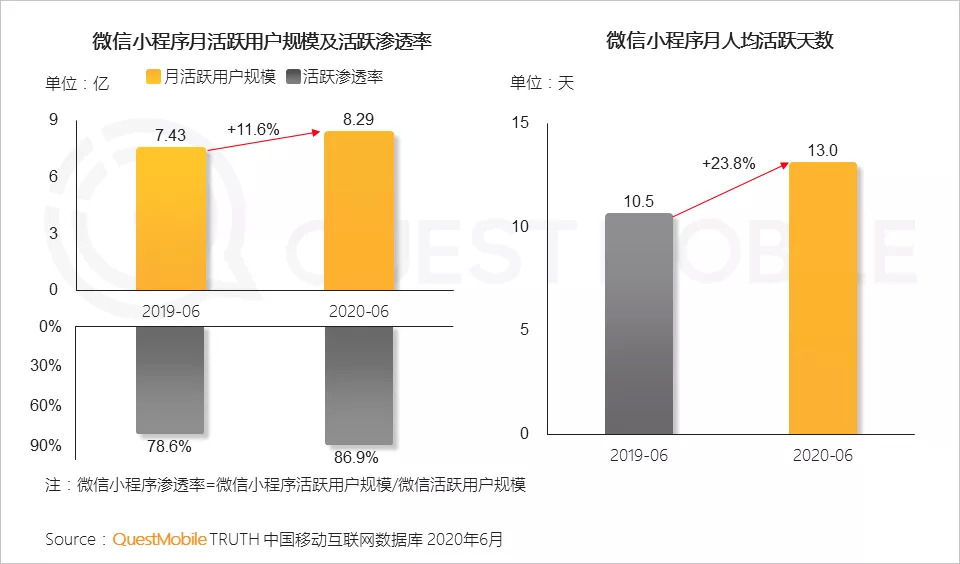 1、微信小程序流量保持两位数增长,在微信中的活跃渗透率已达86.9%,用户使用习惯加速养成,人均活跃天数同比提升23.8%