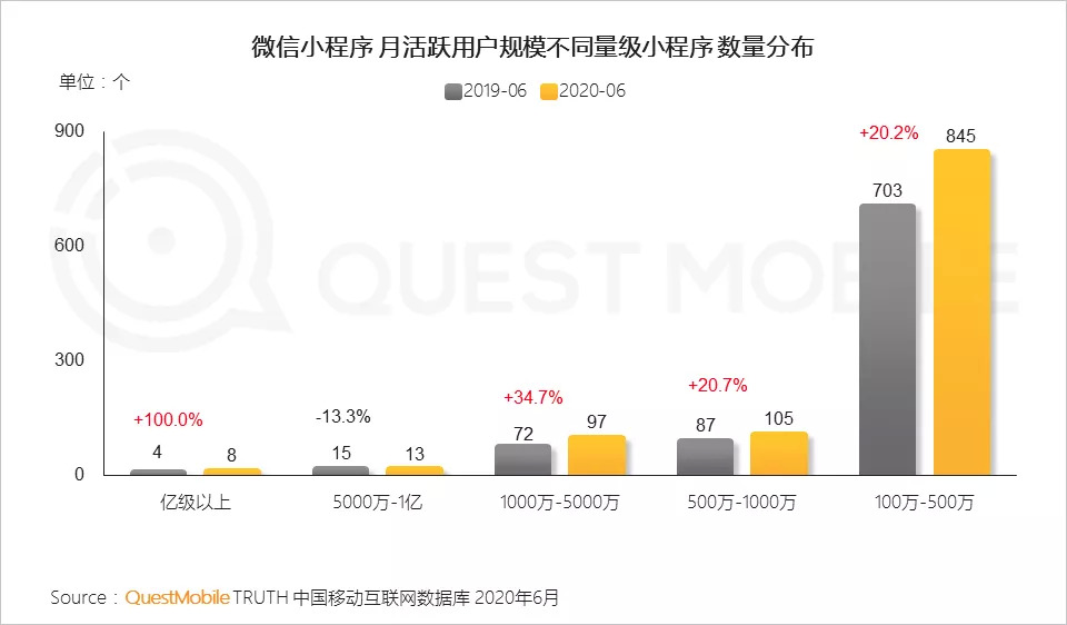 5、月活跃用户规模百万量级以上小程序更多集中在100万-500万区间;头部聚集趋势显现,亿级以上小程序已增加到8个