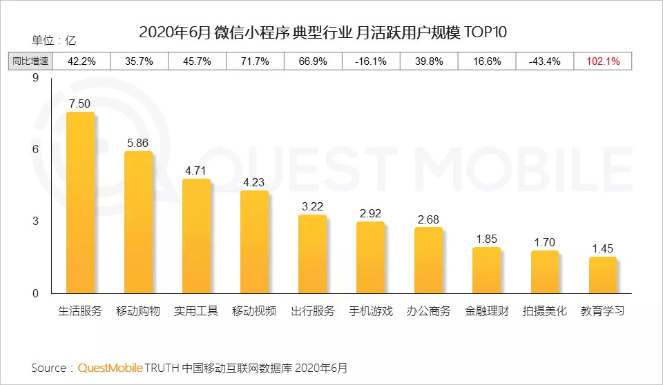 6、微信小程序的活跃用户主要集中在生活服务及移动购物领域,疫情影响带动下,多行业实现大幅上涨,其中教育学习行业同比增速达102.1%